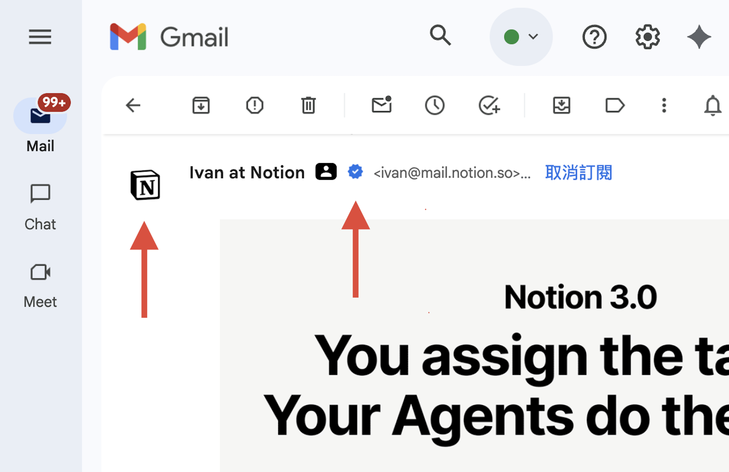 Gmail 藍色勾勾如同社群平台的認證標章,向收件者傳達「這是經過驗證的正式信件」,大幅降低被視為詐騙信的風險。